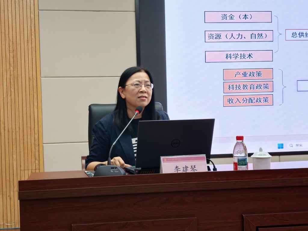 刘颖老师对李建琴教授的到来表示热烈欢迎,并简要介绍了李教授在产业经济学、规制经济学等领域的研究及教学成果。李建琴教授以其深厚的学术造诣和丰富的实践经验,从宏观经济运行分析框架出发,系统梳理了改革开放以来中国宏观经济的波动历程与调控策略,并结合宏观经济学理论对当前复杂多变的经济形势进行了全面而深入的分析。