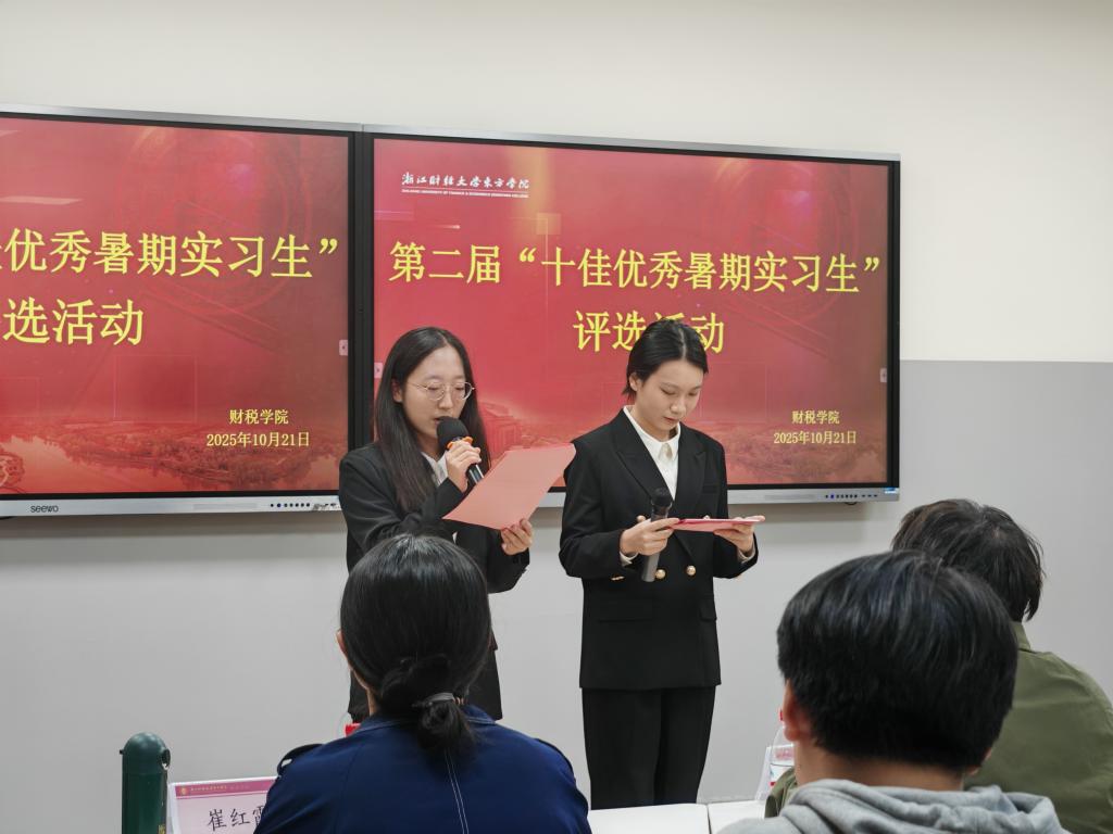 2025年10月21日,财税学院第二届“十佳优秀暑期实习生”评选活动在J6-401成功举办。本次活动旨在展示2023级学生在专业实践(1)中的丰硕成果,树立起一批可学可鉴的实践榜样,充分调动我院学生参与实习的主动性与积极性,全面提升学生的实践能力和综合素养。