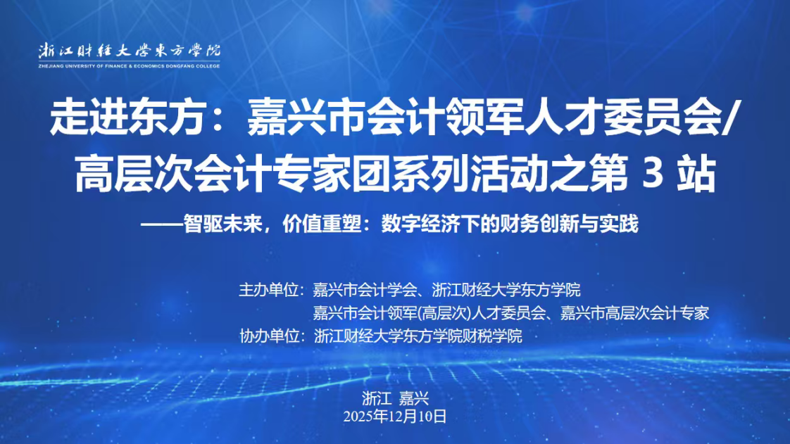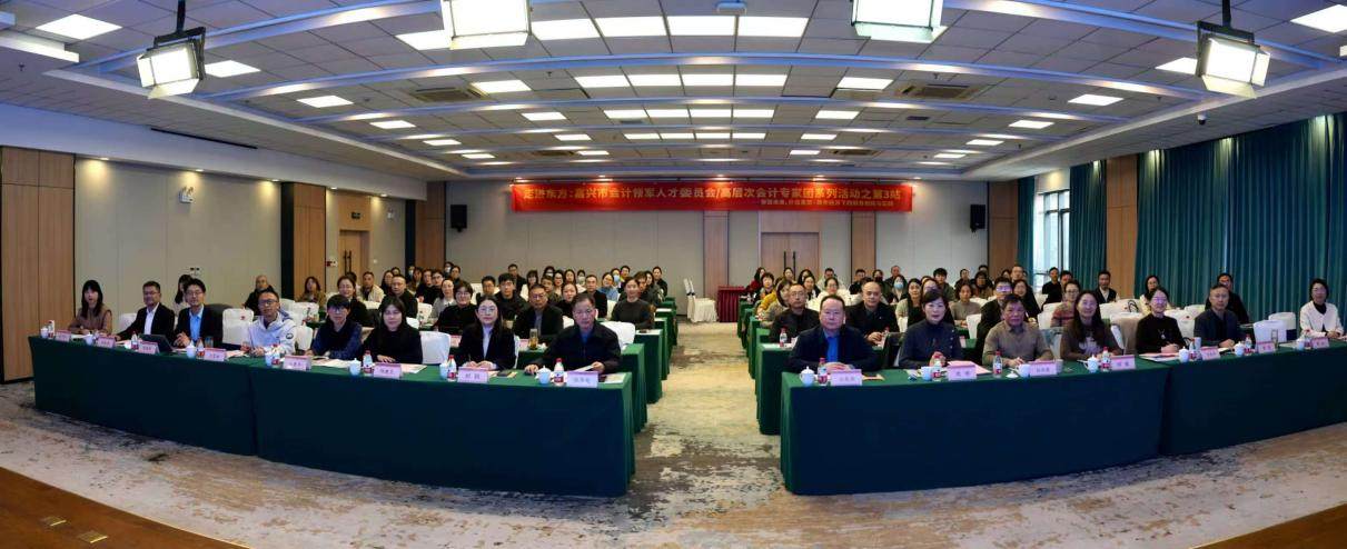 2025年12月10日下午,“走进东方:嘉兴市会计领军人才委员会/高层次会计专家团系列活动之第3站”在我院顺利举办,学院副院长张伟飚,嘉兴市、海宁市两级财政部门职能科室负责人,会计学会负责人,以及学院财税学院负责人、有关教师代表参加。本次活动以“智驱未来,价值重塑:数字经济下的财务创新与实践”为主题,吸引了企事业单位财会领域专家及实务工作者等百余人参会。