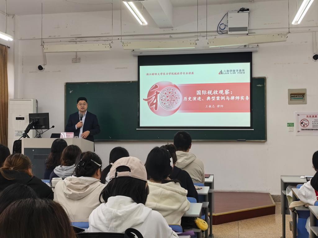 2026年4月13日下午,财税大讲坛2026年第二讲在6教102教室举行。本次讲座邀请六和律师事务所财税与海关法律业务部主任、高级合伙人王敏志律师担任主讲人。王律师以“国际税收观察:历史演进、典型案例与律师实务”为主题,为本学期学习《国际税收》课程的25税收C1班同学展开了一场理论与实践并重的深度分享。讲座由刘颖教授主持。